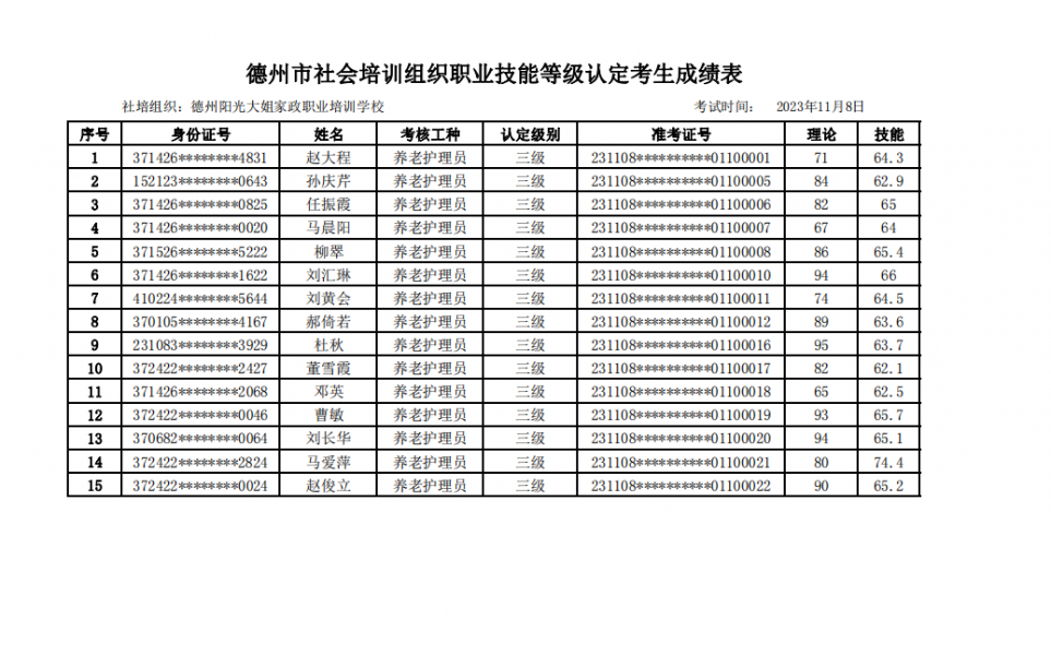 根據(jù)《山東省技能人才社會培訓(xùn)組織評價考核工作規(guī)則》規(guī)定和要求 ,通過考核,現(xiàn)將我校20231108期社會職業(yè)技能等級認(rèn)定成績予以公示,接受社會監(jiān)督。公示期5日,自2023年11月18日至2023年11月24日。公示期間如有異議,請撥打監(jiān)督電話0534-2258869。??