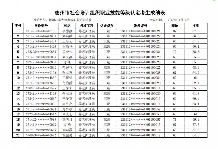 根據(jù)《山東省技能人才社會培訓(xùn)組織評價(jià)考核工作規(guī)則》規(guī)定和要求 ,通過考核,現(xiàn)將我校20231112期社會職業(yè)技能等級認(rèn)定成績予以公示,接受社會監(jiān)督。公示期5日,自2023年11月17日至2023年11月23日。公示期間如有異議,請撥打監(jiān)督電話0534-2258869。