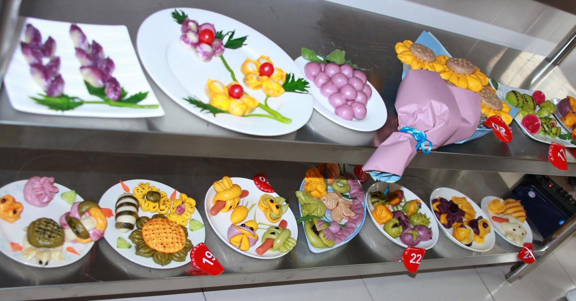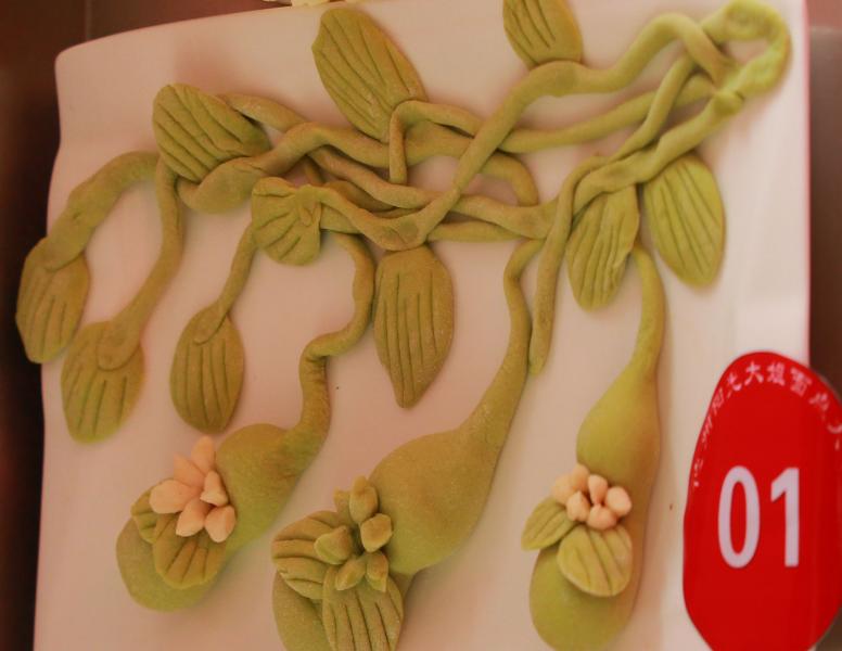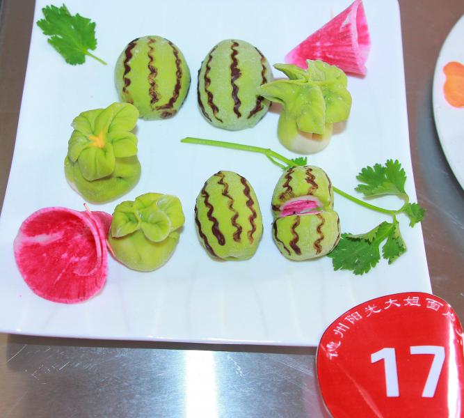 比賽一開(kāi)始,大姐們就立即投入制作,揉面、剁餡……每一道工序有條不紊進(jìn)行。制作過(guò)程中她們一絲不茍,耐心細(xì)致,將一份份精致誘人、創(chuàng)意新穎、美味的面點(diǎn)呈獻(xiàn)在大家面前,有含苞待放的玫瑰卷、軟糯香甜的紫薯卷、惟妙惟肖的小豬、風(fēng)味獨(dú)特的披薩、外焦里嫩的紅豆餅、色香俱全的蒸餃、形象逼真的紅辣椒、茄子、西瓜……大姐們用嫻熟精湛的制作手法做出了一道道令人垂涎欲滴的美味面點(diǎn),小小的面團(tuán)在她們手里百般變化,化成一道道舌尖的美味。令在座的評(píng)委老師們老師們贊嘆不已!