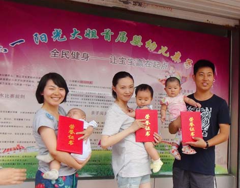 ? ? 全民健身從寶寶做起。為了讓更多媽媽了解嬰幼兒游泳的益處,更好地推廣嬰幼兒益智開發(fā)游泳。6月1日,陽(yáng)光大姐首屆嬰幼兒親子比賽在我公司水育中心舉行, 50余名寶寶分四組賽齡參加了游泳比賽和親子闖關(guān)比賽,共評(píng)出一二三等獎(jiǎng)各四名。本次比賽得到了寶寶及家長(zhǎng)們的積極參與。獲獎(jiǎng)寶寶還得到了人生第一本證書和豐厚的獎(jiǎng)品。