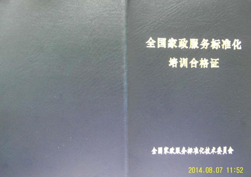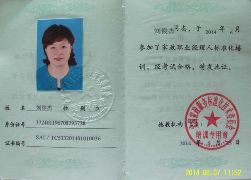祝賀公司劉俊杰經(jīng)理獲得全國家政服務標準化技術(shù)委員會頒發(fā)的首批經(jīng)理人標準化培訓班合格證書