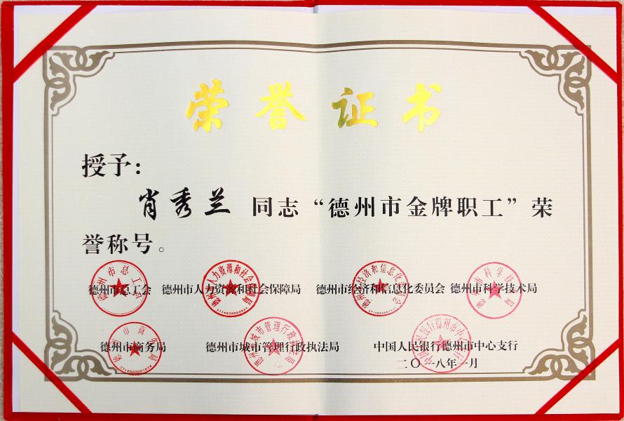 ? ? ? ? 育嬰師工種前五名被我單位獨(dú)攬,肖秀蘭、王秀梅分獲第一、第二名,均被授予“德州市五一勞動(dòng)獎(jiǎng)?wù)隆狈Q號(hào),肖秀蘭還同時(shí)被授予“德州市金牌職工”稱號(hào)并獲5000元獎(jiǎng)金,龐靈君、顏美娟、劉麗分獲第三、四、五名。